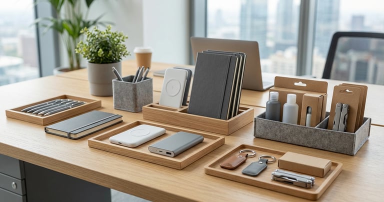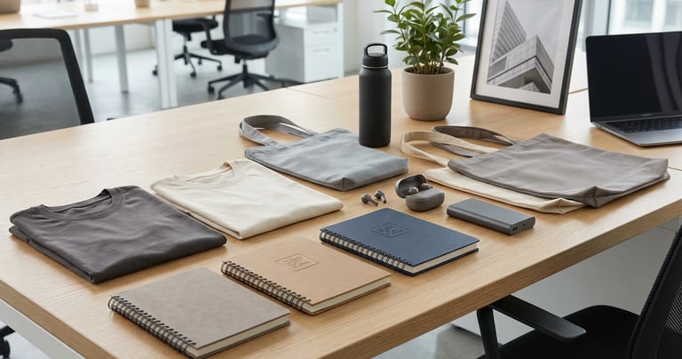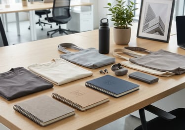 Custom-branded merchandise including apparel, accessories, tech items, and premium kits designed to enhance brand visibility and long-term usage.